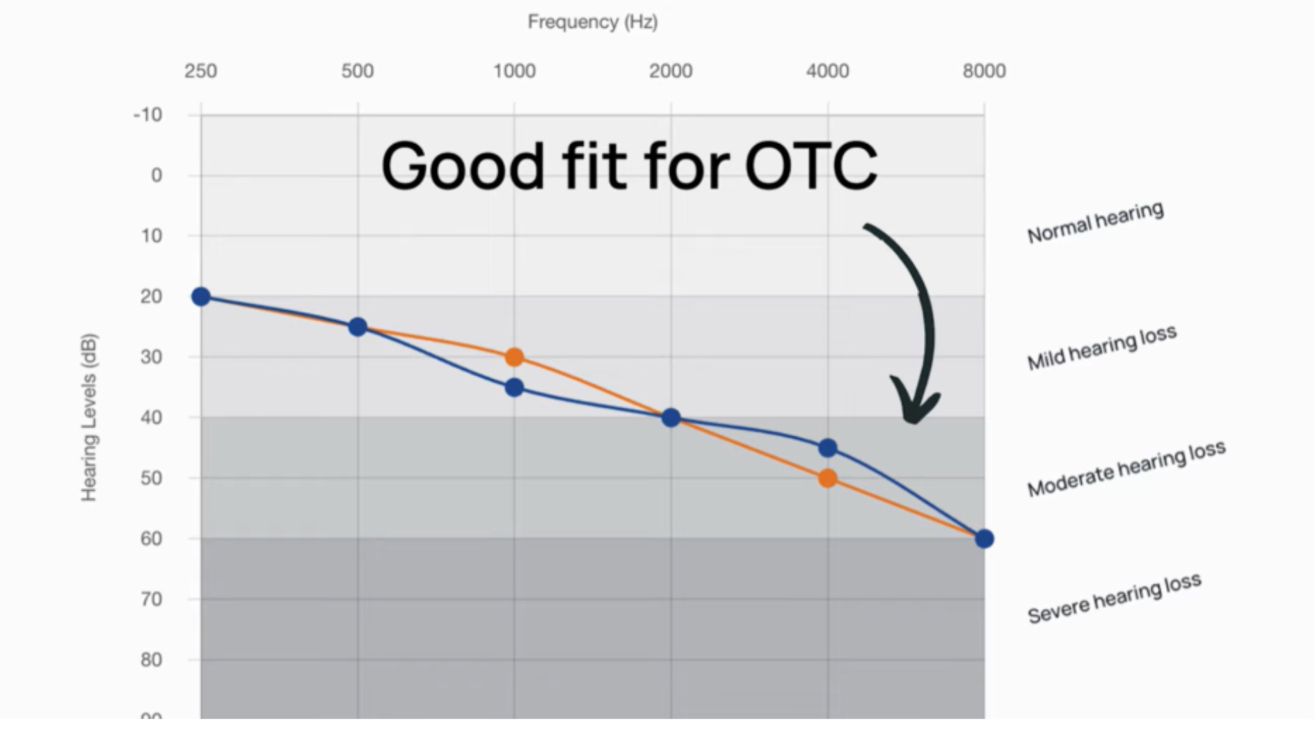 If your hearing test chart looks like the lighter curve, you may be a good candidate for over-the-counter hearing aids like Sennheiser All-Day Clear or Jabra Enhance Select.