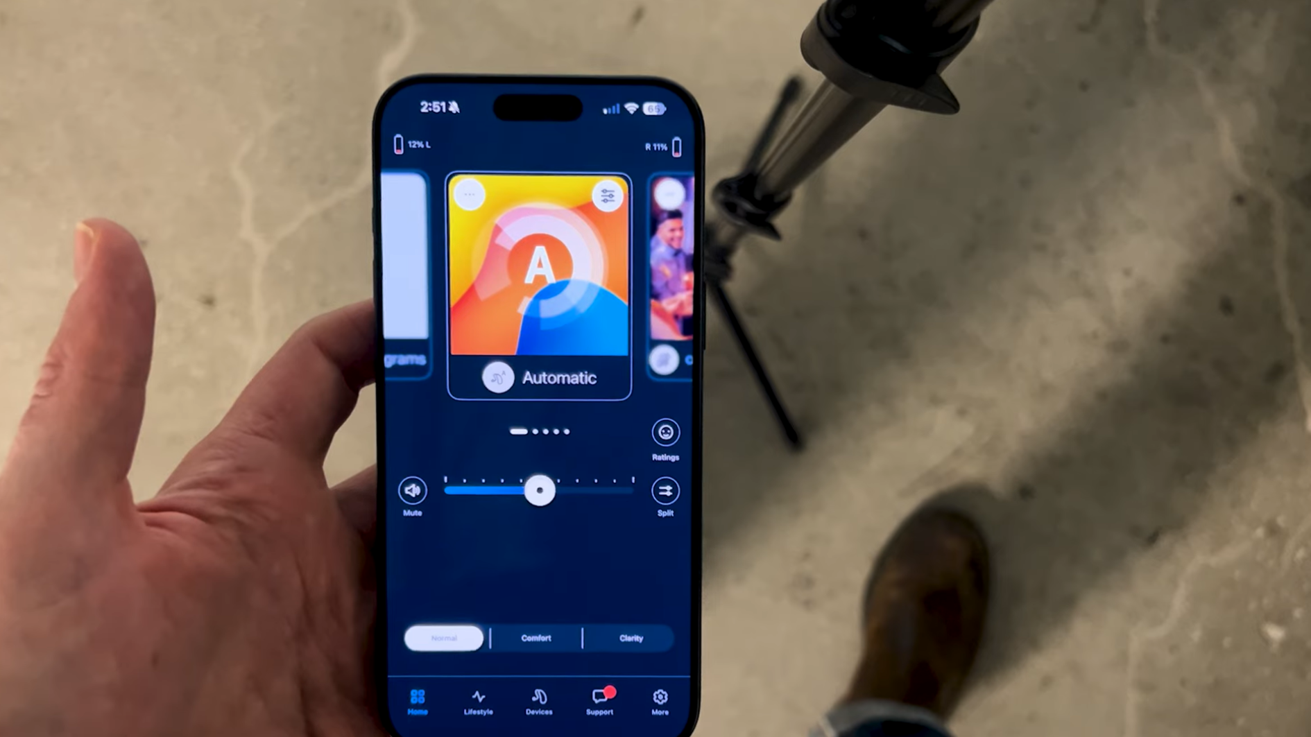 At the center of the experience is Automatic mode, where the hearing aids continuously adjust to your environment for the best overall sound. From there, you can quickly fine-tune your listening experience by moving between comfort and clarity, adjusting volume, or splitting volume between ears if needed.